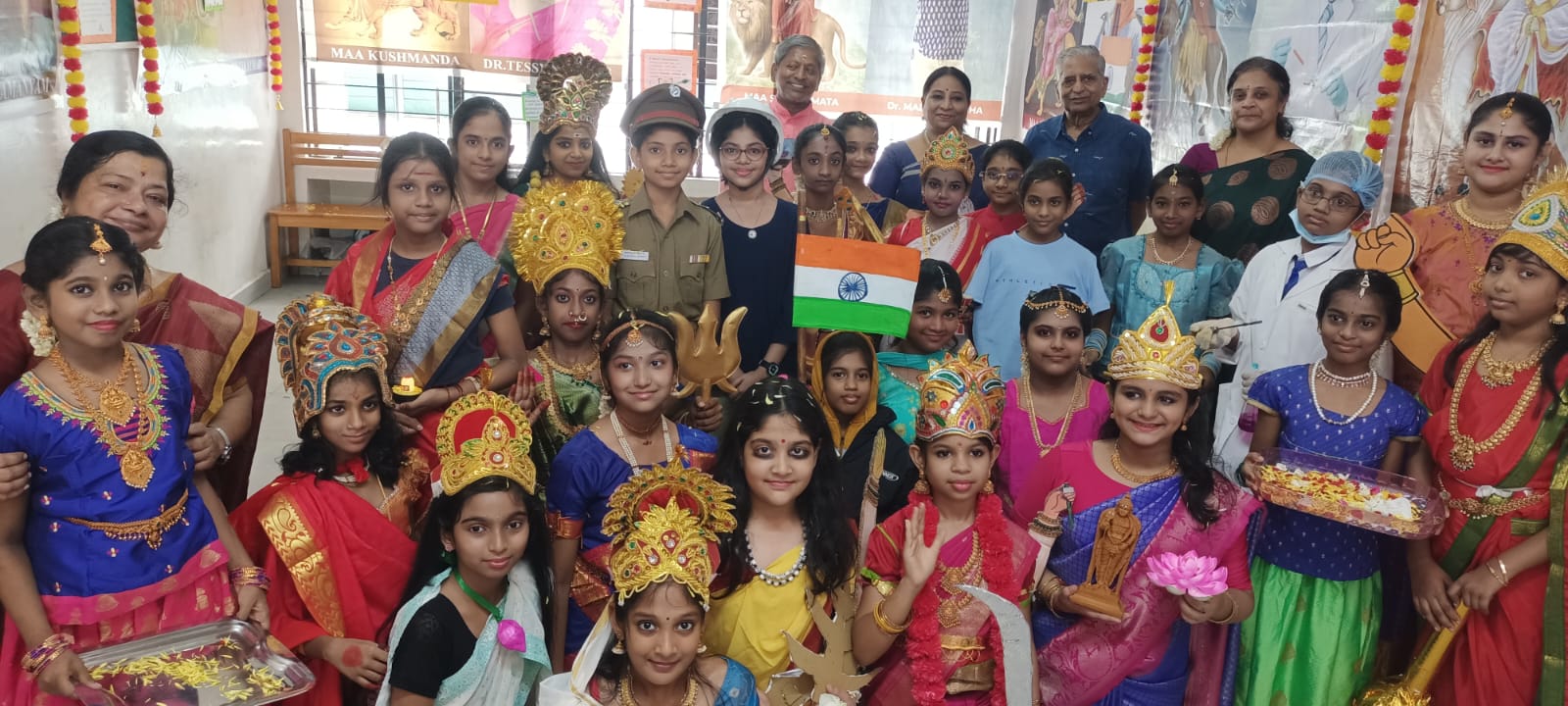 On 13th August, the school reverberated with divine vibrations during the Mass Vishnu Sahasranamam chanting. The collective voices of students chanting in unison created a serene and spiritual atmosphere, invoking blessings of Lord Vishnu. The chanting was followed by the joyous Janmashtami celebrations in the Kindergarten section. The little ones, dressed adorably as Krishna and Radha, brought alive the spirit of devotion and festivity. The classrooms were beautifully adorned with flowers and decorations, while the children sang bhajans, chanted shlokas, and participated in fun-filled traditional games. Dressed in colourful attire, the students radiated joy and innocence, making the celebration a memorable offering of love and devotion to Lord Krishna.