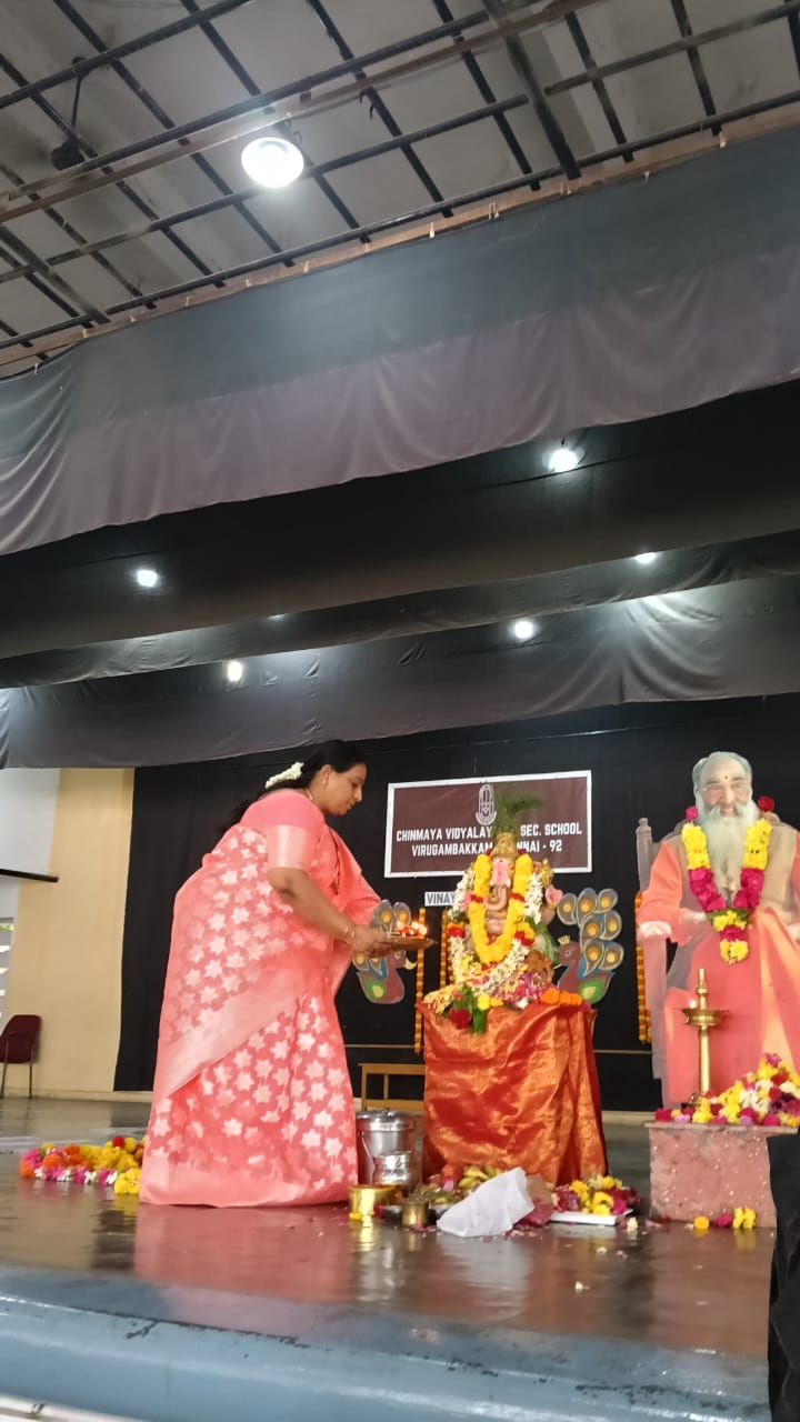 Smt. Shanthi Mulayath, a devoted seeker and sevak of Chinmaya Mission, Chennai, who graced the event as the Chief Guest. The programme included the sacred Veda Vyasa Puja and the Guru Paduka Puja offered at the holy feet of our Pujya Gurudev Swami Chinmayananda. With devotion and reverence, students and staff offered their salutations to Him — our eternal guiding light — whose wisdom continues to inspire and illuminate our path.